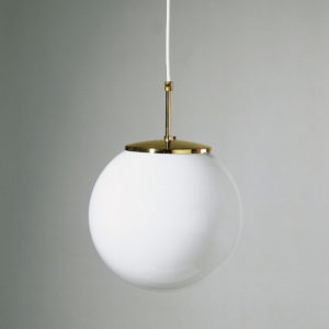 Klassische Kugelpendelleuchte mit einer hochwertigen Aufhängung aus Reinmessing. Abdeckung aus mundgeblasenem triplex Opalglas matt oder glänzend.